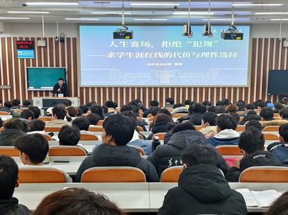 (通讯员 马子涵)12月14日,体育学院“鲲鹏引航”系列讲座2025年第11期在南湖综合楼N119举行。本次讲座邀请华中农业大学本科生院思想政治教育管理处处长周雷,为2025级全体新生开展主题为“人生赛场,拒绝‘犯规’——求学生涯红线的代价与理性选择”的分享,旨在帮助新生强化规则意识,明确求学过程中的行为底线。