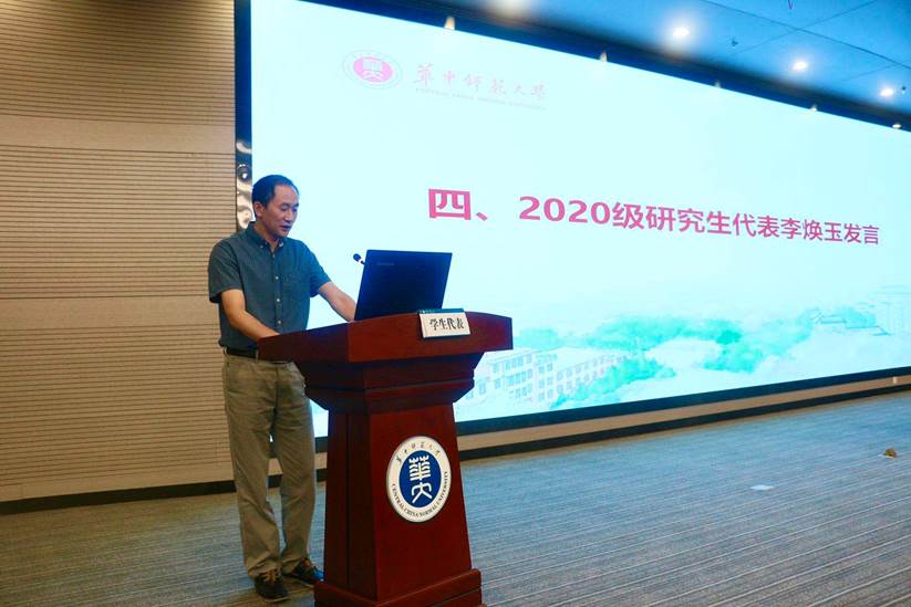 典礼伊始,学生代表们首先进行了发言。体育学院学生会主席2018级薛爽同学作为学姐表达了对新同学的热烈欢迎,并回顾过往为大家分享了多彩的校园生活和学习经验,期待着大家能够把握豆蔻年华,谱写绚丽多彩的人生篇章;有着丰富的工作经验和人生阅历的2020级博士研究生代表李焕玉发言,关于成长历程他有三点体会和感悟,第一是心存梦想,助力前行,第二是规划人生,奋力全行,第三是脚踏实地,平稳前行,鼓励2020级乘风破浪的全体新生继续前行;2020年校级军训之星巩旭发言,表达了初次来到华师,来到南湖畔,真正成为桂子山新主人的激动心情,希望军训期间培育锻炼的意志品质能够为我们丰富多彩的大学生活打下良好的基础。学生代表们的激情发言展现了华师人朝气蓬勃、意气风发的精神面貌,引发热烈掌声。