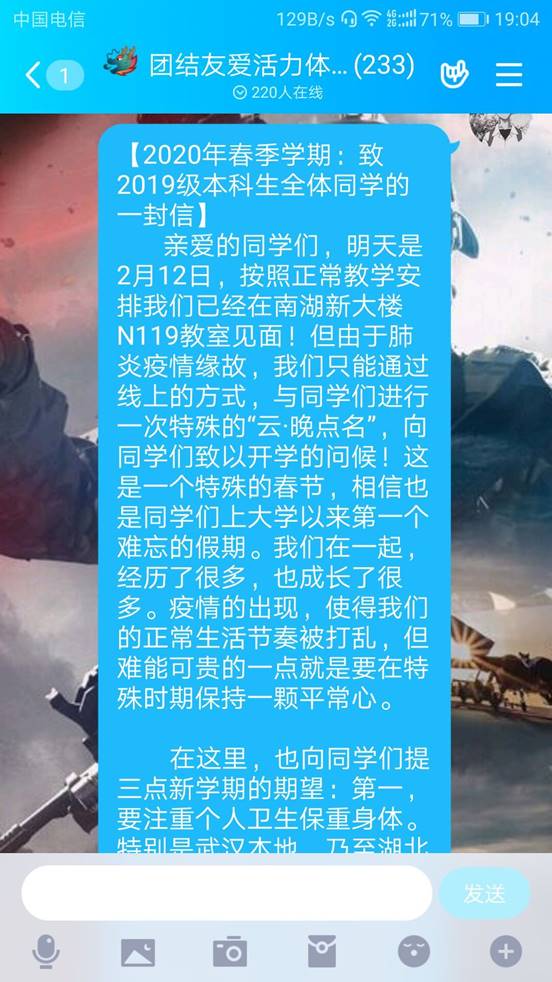 2019级辅导员刘鸿畅同样采取网上云点名的形式。自疫情发生以来,全面了解学生的去向动态并及时转载权威疫情通报,对放假后学生的去向动态进行摸排,精准到个人。并针对疫情情况,实时发布权威疫情通报。发动学生骨干监督同学们进行健康情况报告,确保同学们生命健康安全。