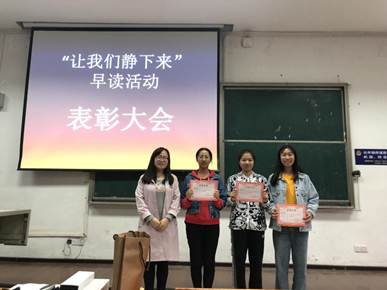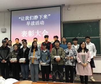 (通讯员 宋柯瑶)为进一步落实立德树人根本任务,提高人才培养质量,促进学生成长成才,营造体育学院良好的学习氛围,本学期伊始,在赵苗苗老师的组织指导下,2018级开展了以班级为单位的“让我们静下来”早读活动,4月26日下午,此次活动的表彰大会在T101教室顺利举行。