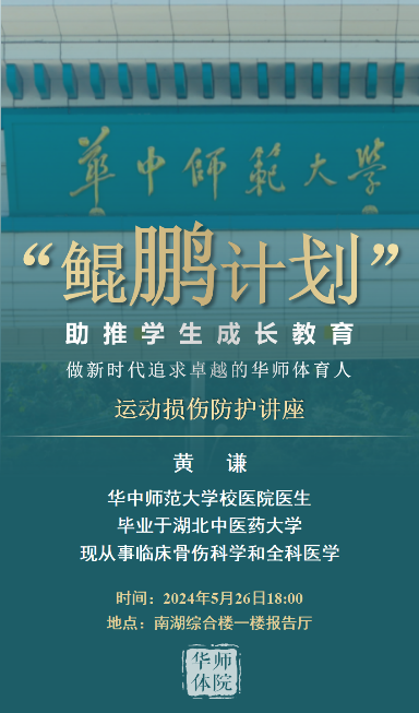 (通讯员 薛爽 张泽康 黄旭东)为帮助学生更好应对体育活动中的突发损伤,明确大学生参保、就诊及医疗报销要求及流程,5月26日晚,由体育学院致远心理工作站组织的“鲲鹏计划”助推学生成长专题教育第九期——《运动损伤防护主题教育》在南湖综合大楼一楼报告厅开展。本次讲座由华中师范大学校医院临床骨伤科学和全科医学医生黄谦主讲,体育学院2021级、2022级、2023级500余名本科生参与学习。体育学院辅导员张俊仓、薛爽参加活动,辅导员张俊杰主持活动。