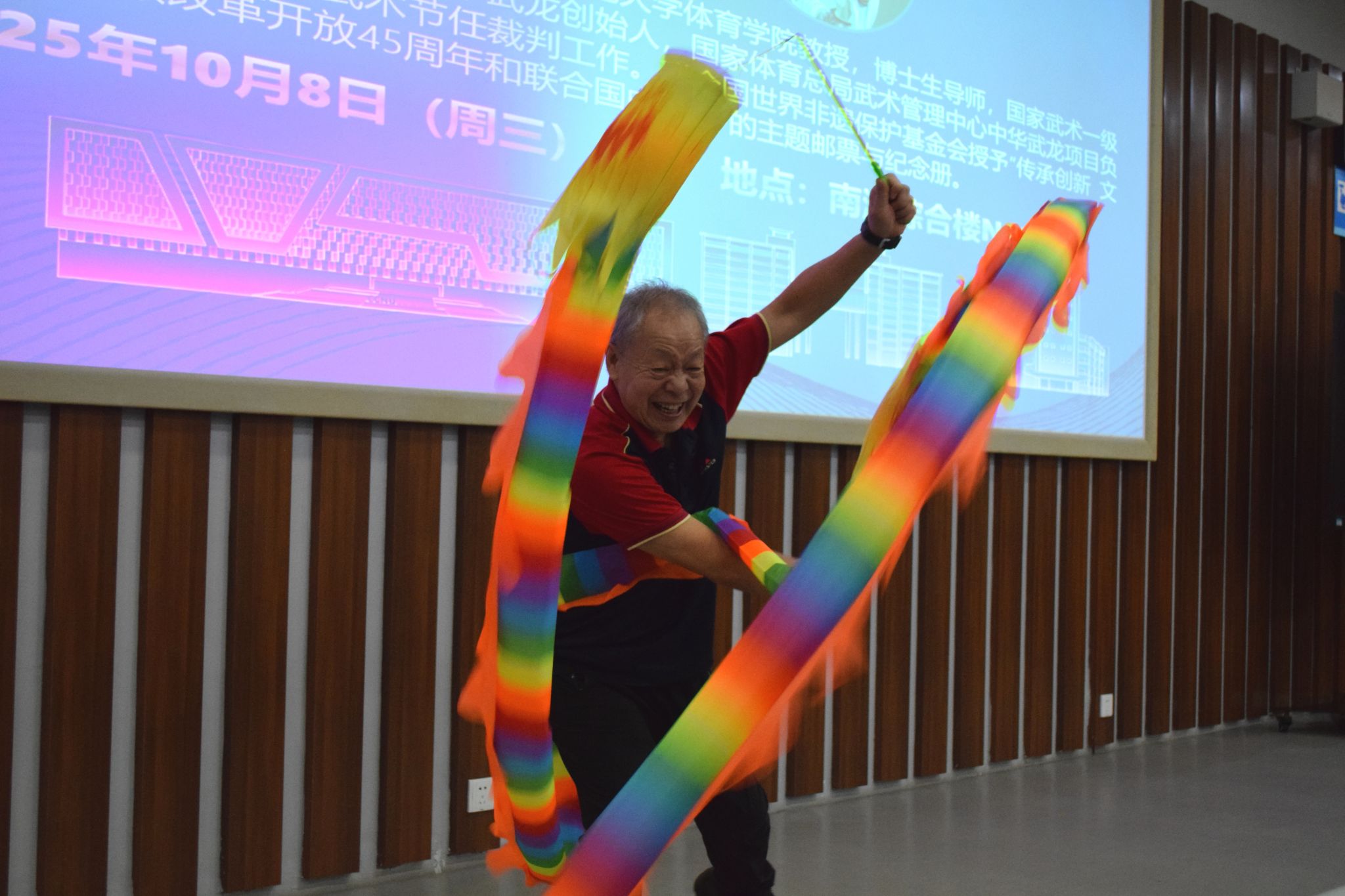 谈及个人独创的中华武龙项目,郑勤教授详细介绍了这一融合武术拳术、器械技击与舞龙技术的创新项目。随后现场展示了武龙表演,龙身腾跃间,将武术的刚劲与舞龙的灵动完美融合。