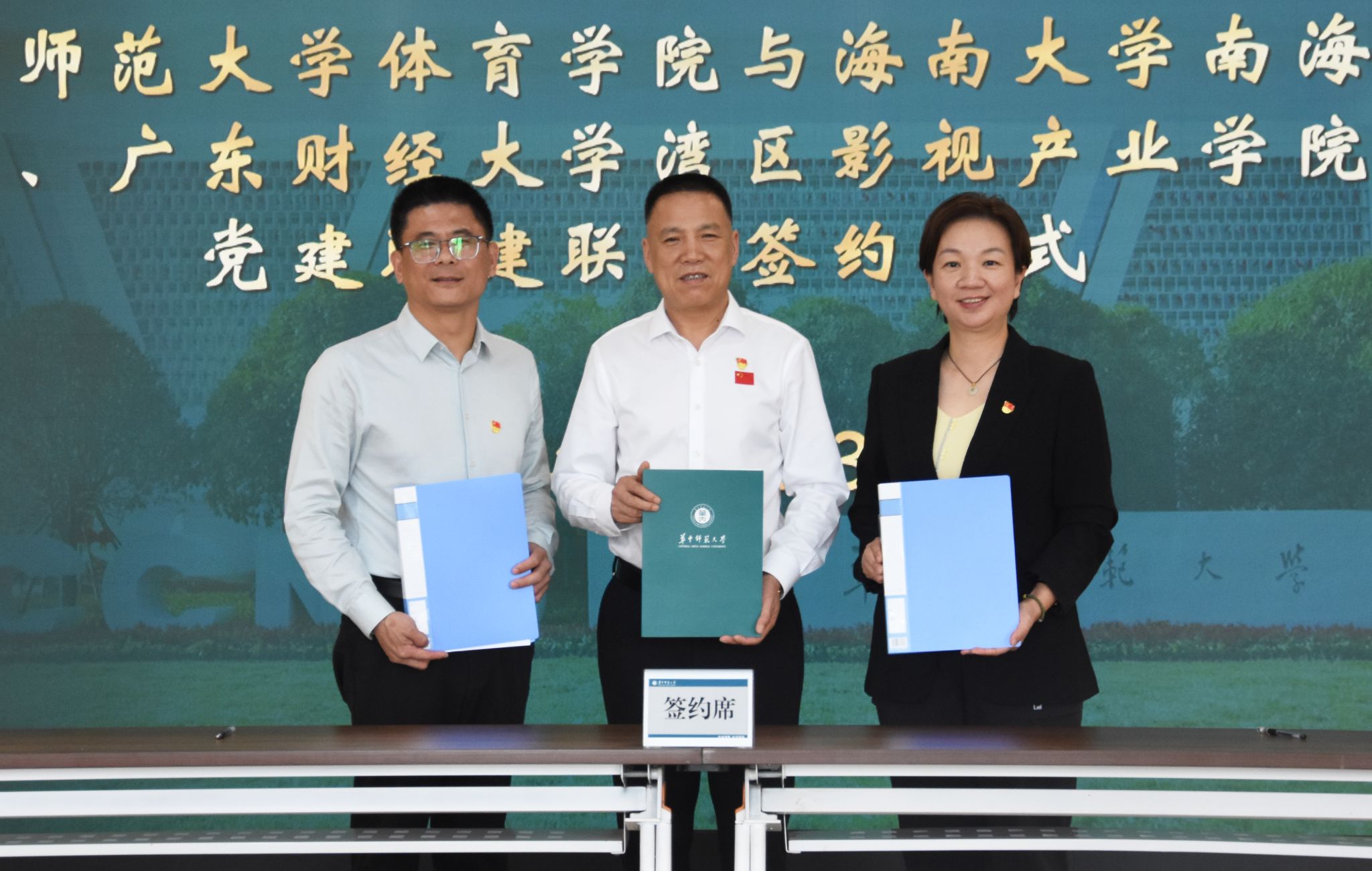 (通讯员 蔡依欣)为进一步践行全国高校“双带头人”教师党支部书记“强国行”专项行动,落实立德树人根本任务,4月23日,华中师范大学体育学院与海南大学南海书院、广东财经大学湾区影视产业学院党建联建联学签约仪式在南湖综合楼9115报告厅举行,海南大学南海书院党委书记冯社洪,广东财经大学湾区影视产业学院党委书记陈莎莉,华中师范大学体育学院党委书记王东爽、教工第二党支部书记鲁长芬、党务干事李勤、鲲鹏班学生党支部书记彭媛参加仪式。我院党委副书记张德华主持仪式。