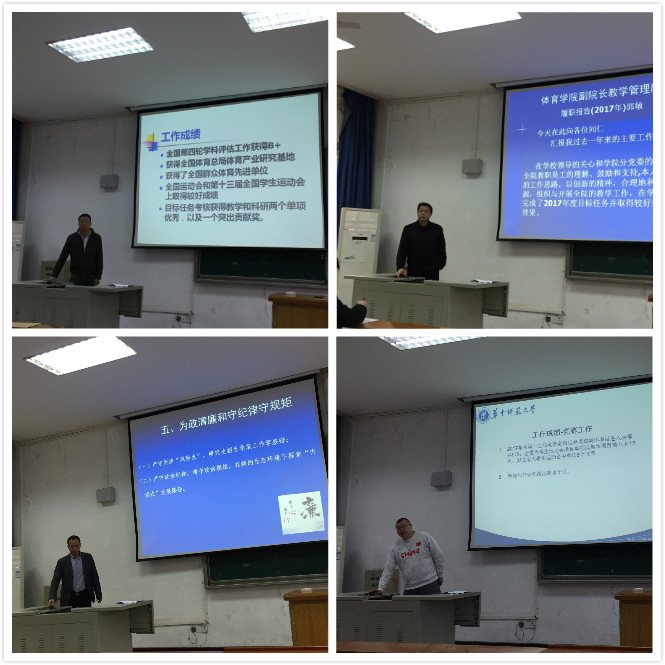 王健书记首先代表我院领导班子作《2017年度体育学院领导班子述职汇报》,他从政治素质、团结协作、作风形象、清正廉洁和工作业绩五大方面汇报了我院领导班子2017年的工作情况。他指出,过去一年,学院领导班子认真学习贯彻党的十九大精神和习近平新时代中国特色社会主义思想,在学校党政领导下,遵守党纪国法,坚持社会主义办学方向,加强了党建工作,狠抓党风廉政建设,以学校目标任务为指向,团结协作,坚持民主集中制,提高科学决策能力,推进了学院各项事业的发展。紧接着,王书记从政治品质和思想道德、工作能力及管理、精神状态和工作投入、履行职责和工作实效、清正廉洁几个方面作了个人报告。
