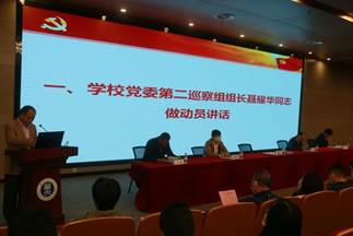 校党委第二巡察组组长聂耀华同志做动员讲话。他指出第二巡察组要以习近平新时代中国特色社会主义思想为指导,深刻把握巡察内涵,精准发现问题,紧扣体育学院党委职能责任,按照中央“四个落实”的要求,教育部党组“三个紧扣”,“七个紧盯”的任务要求,坚持问题导向,盯住“关键少数”,查找政治偏差,督促学院党委落实管党治党的政治责任,要把接受巡察组的监督作为重要的政治工作,鼓励和支持师生反映与巡察相关的问题,对巡察发现的问题要全面整改,坚持推动学校事业发展和优化巡察成果运用。