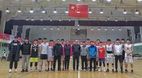 ▲著名国手张勇军(左八)与彭双阶副校长(左九)、体育学院党委书记郭庆(左七),副院长郭宝科(右七)以及计算机、社会学院男篮合影