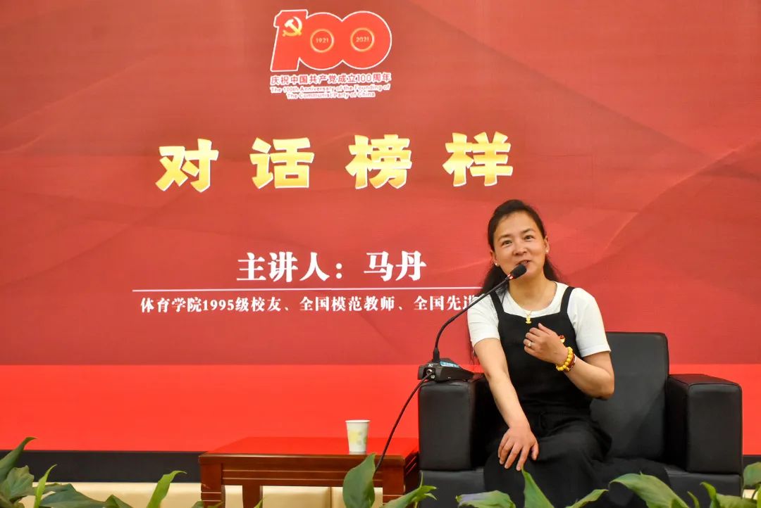 2021年,在建党百年之际,马丹回到体育学院参加“学党史•对话榜样”活动,讲述教育援藏的动人故事,以榜样力量引领青年担当,涵养体育学子教育情怀。