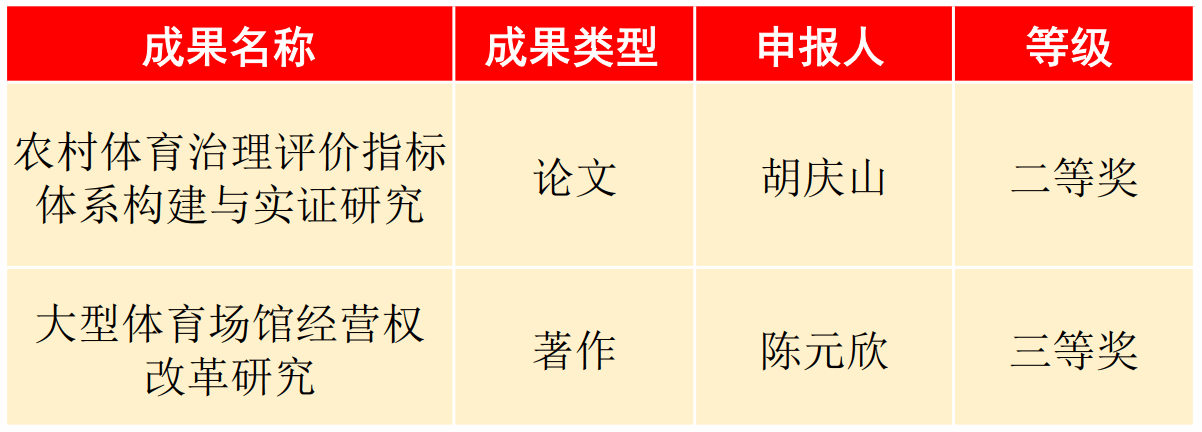 体育学方面,本届共评选出著作论文奖22项,含一等奖2项、二等奖9项、三等奖11项;咨询服务报告奖1项;青年成果奖4项。其中我院成果获得著作论文奖二等奖、三等奖各一项,位居全国体育院校前列。