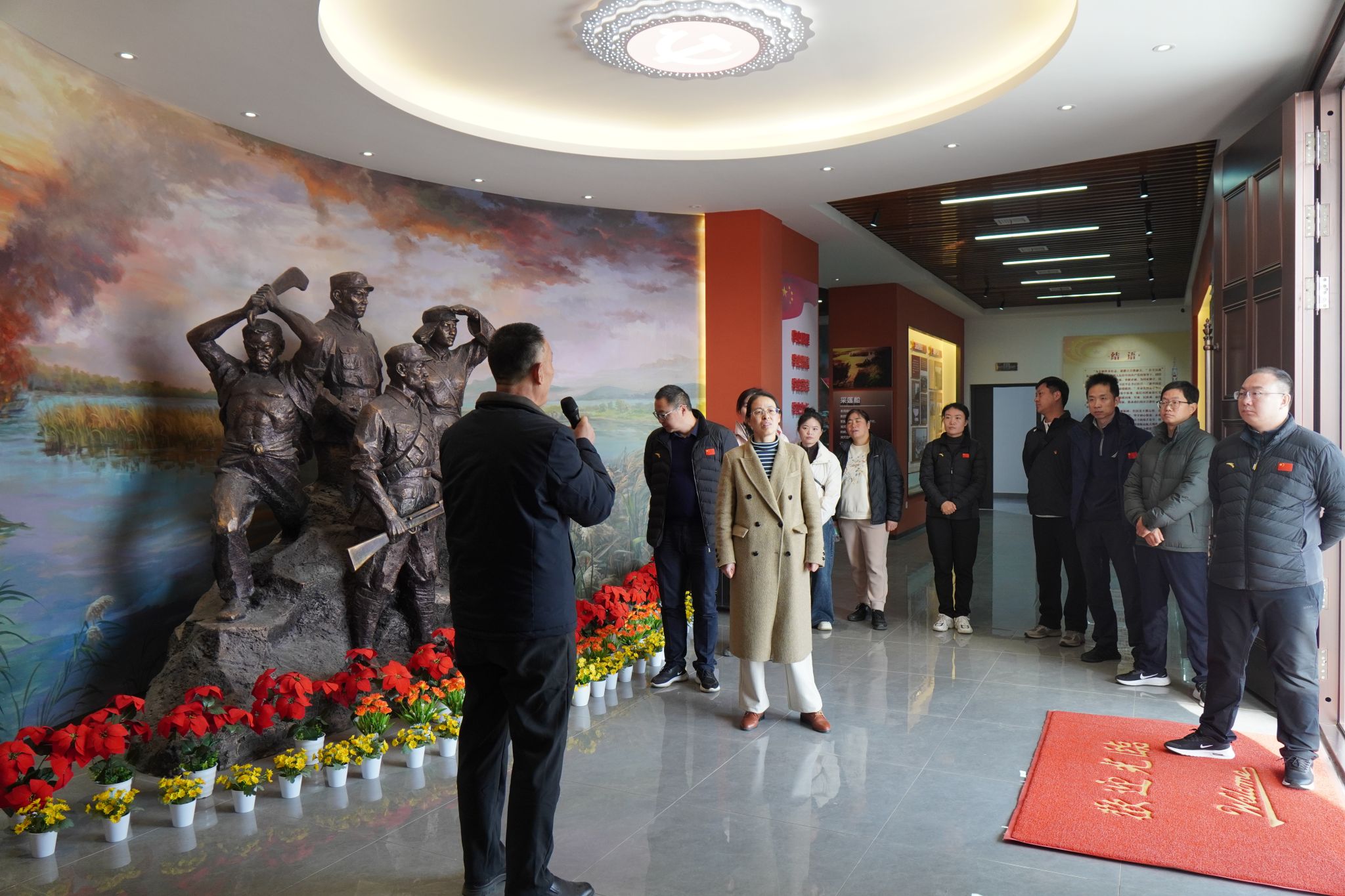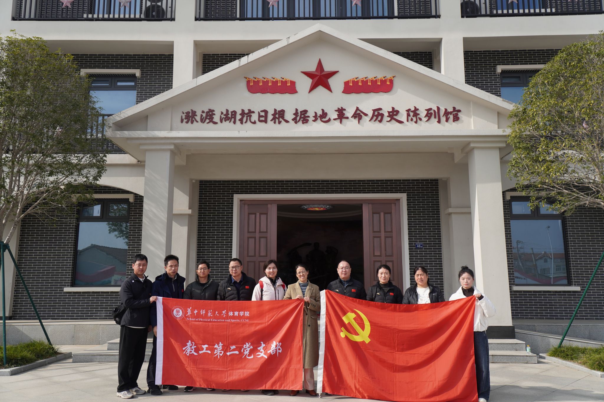 活动第二阶段,支部联建学院教工第一支部共同前往新洲区涨渡湖爱国主义教育基地和涨渡湖抗日根据地革命历史陈列馆参观学习,聆听革命先辈在这片土地上的战斗故事。抗战时期,涨渡湖是鄂东抗日根据地的重要组成部分,在红色事迹展板前,党员们认真聆听讲解,仔细观看历史图片,重温那段艰苦卓绝的革命岁月,深切感受革命先辈的坚定信念与家国情怀。
