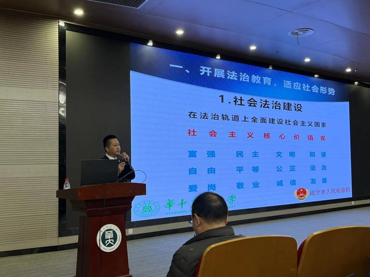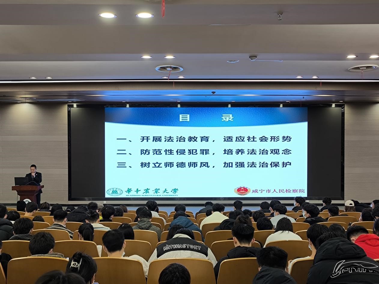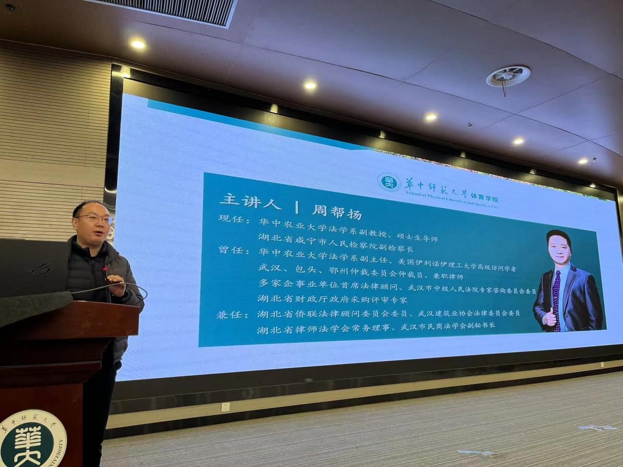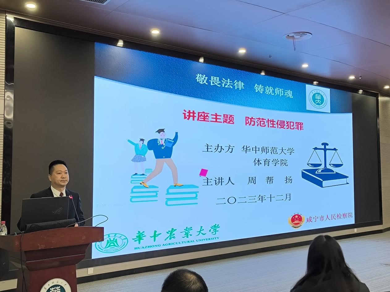 为进一步面向本科生传播和普及法律知识,增强体院学子法制观念,提高学生自我防范意识,12月10日晚18:00体育学院于南湖综合楼一楼报告厅面向2021级、2022级和2023级本科生开展校园法治主题教育。华中农业大学法学系副教授、硕士生导师,湖北省咸宁市人民检察院副检察长周帮扬应邀作主题讲座。讲座由体育学院党委副书记张德华主持,体育学院辅导员张俊杰、张俊仓、薛爽、彭媛,以及600余名本科生参加活动。
